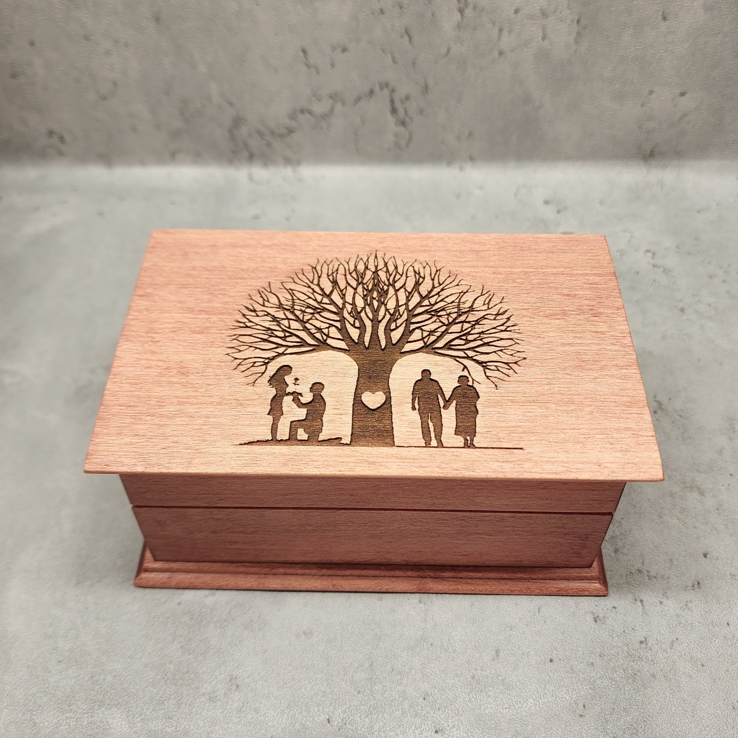 This listing includes 1 wooden musical jewelry box with the carving on pic 1 on it (love couple and tree of life) with your choice of color and song! If you'd like a different engraving, please contact me before placing your order so we can discuss the design and the layout.