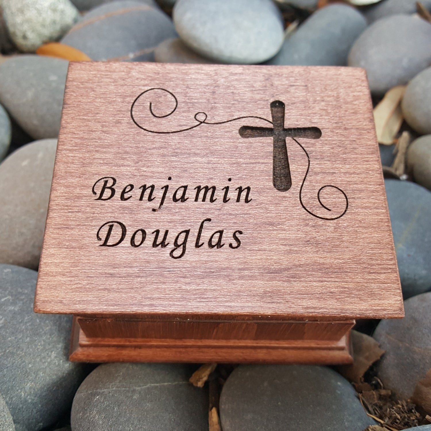 Christening Music Box custom engraved with name and a cross design on top, choose color and song