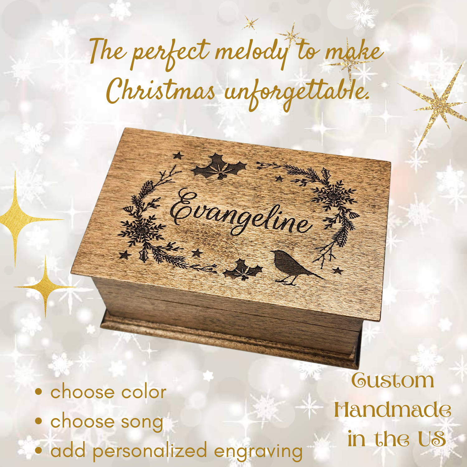 With the endless engraving possibilities and melodies they're suitable for any occasions: birthdays, baby showers, Valentine's day, family reunions, graduations, Mother's day or as bridesmaids gift, maid of honor gifts, mother of the brides gifts, ring bearer gift, thank you gifts or get well gifts as well! Each music box is custom-made in our Florida workshop, designed as a meaningful keepsake and a truly unique Christmas gift.