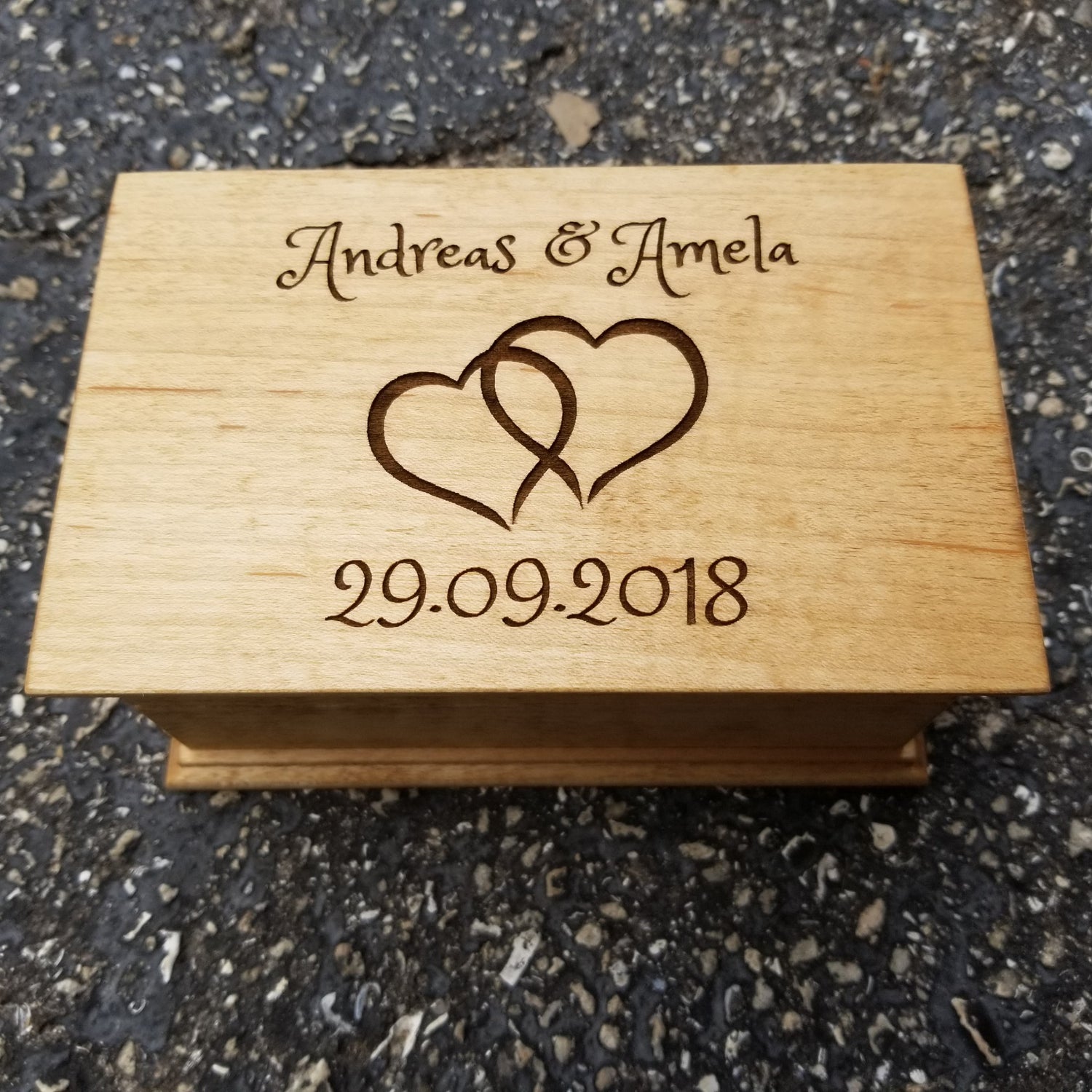 Wedding Jewelry Box with names and date with hearts engraved on top, choose color and song