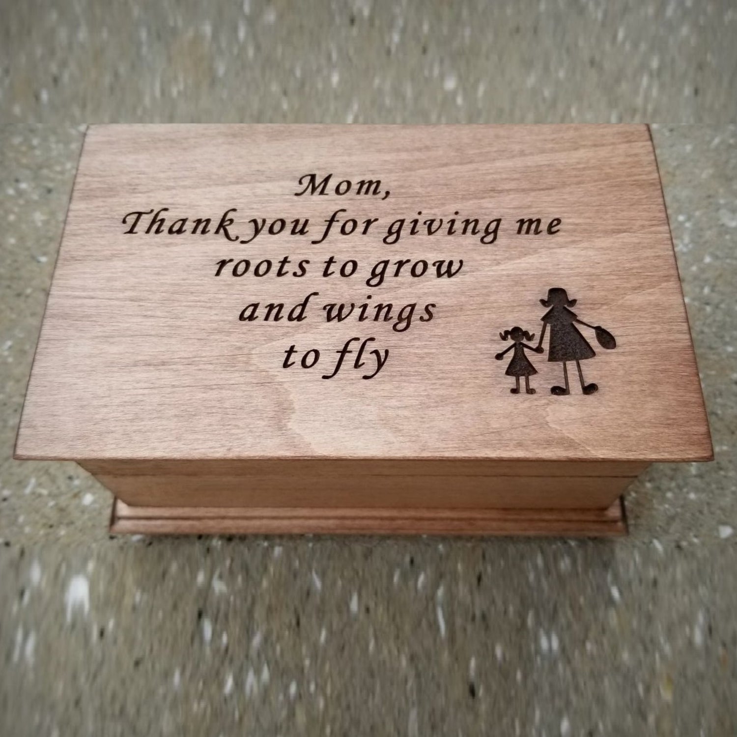 Musical jewelry box for Mom, Thank you for giving me roots to grow and wings to fly and it is made of maple wood and it's made to order!