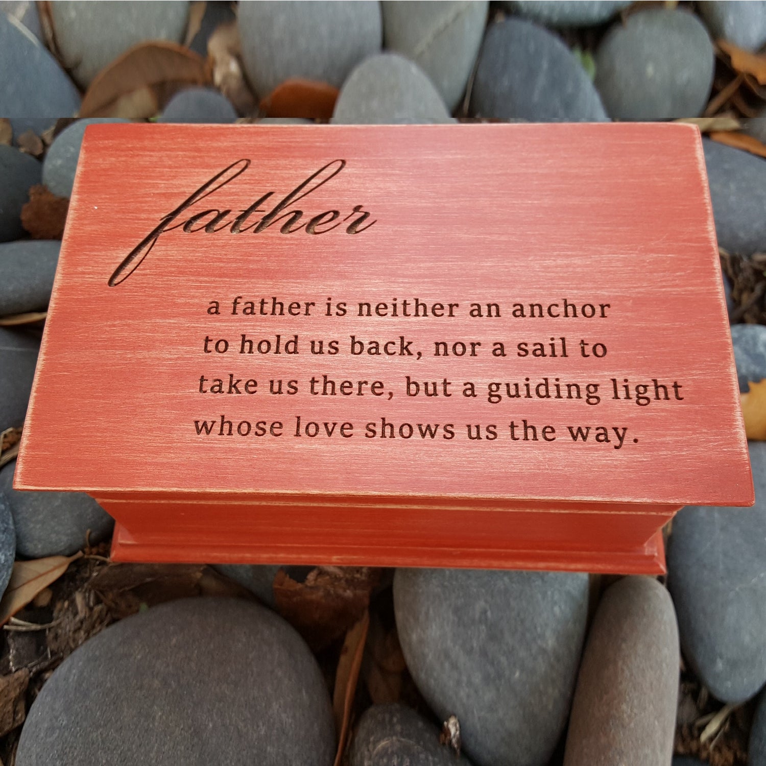 Musical jewelry box for Father with "A father is neither an anchor to hold us back, nor a sail to take us there, but a guiding light whose love shows us the way" engraved on top and it is made of maple wood and it's made to order!