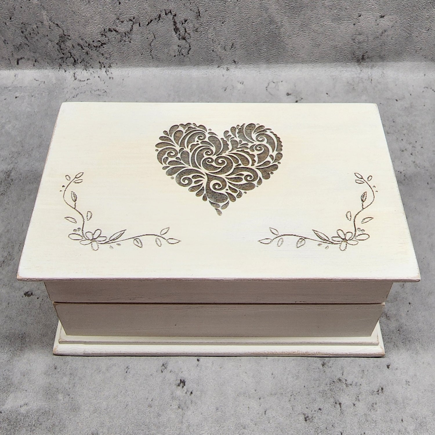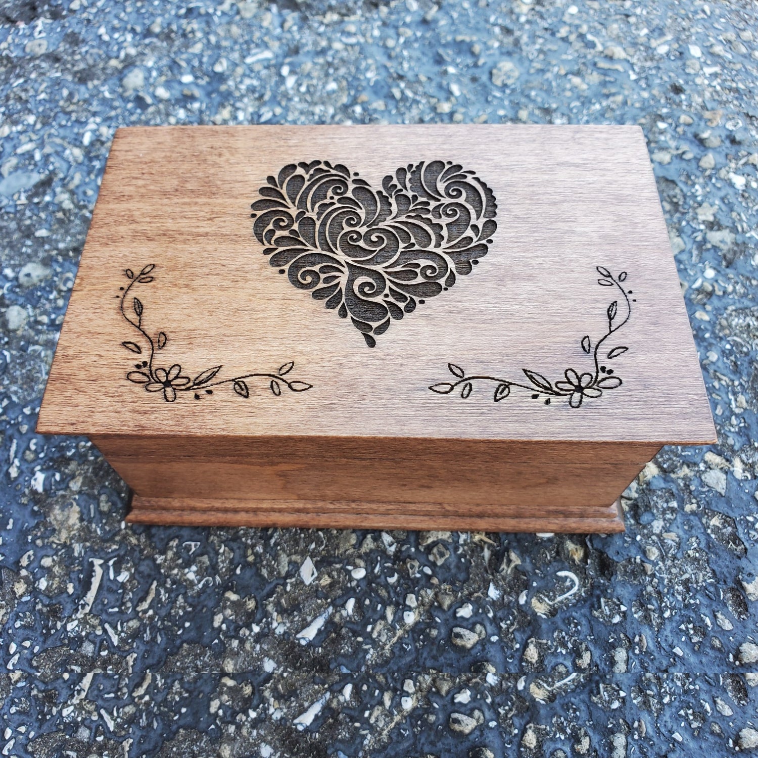 This listing includes 1 wooden musical jewelry box with the carving on pic 1 on it (heart design) with your choice of color and song! If you'd like a different engraving, please contact me before placing your order so we can discuss the design and the layout.