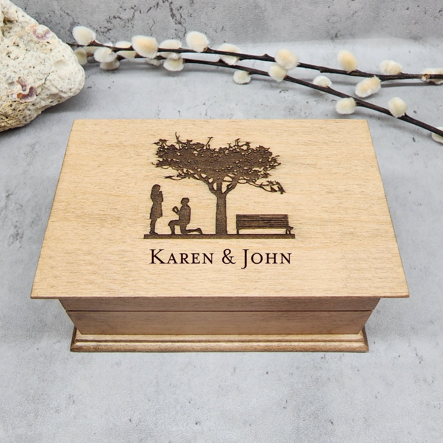 This listing includes 1 wooden musical jewelry box with the carving on pic 1 on it (proposing couple with tree and bench with your names under the image) with your choice of color and song! If you'd like a different engraving, please contact me before placing your order so we can discuss the design and the layout.