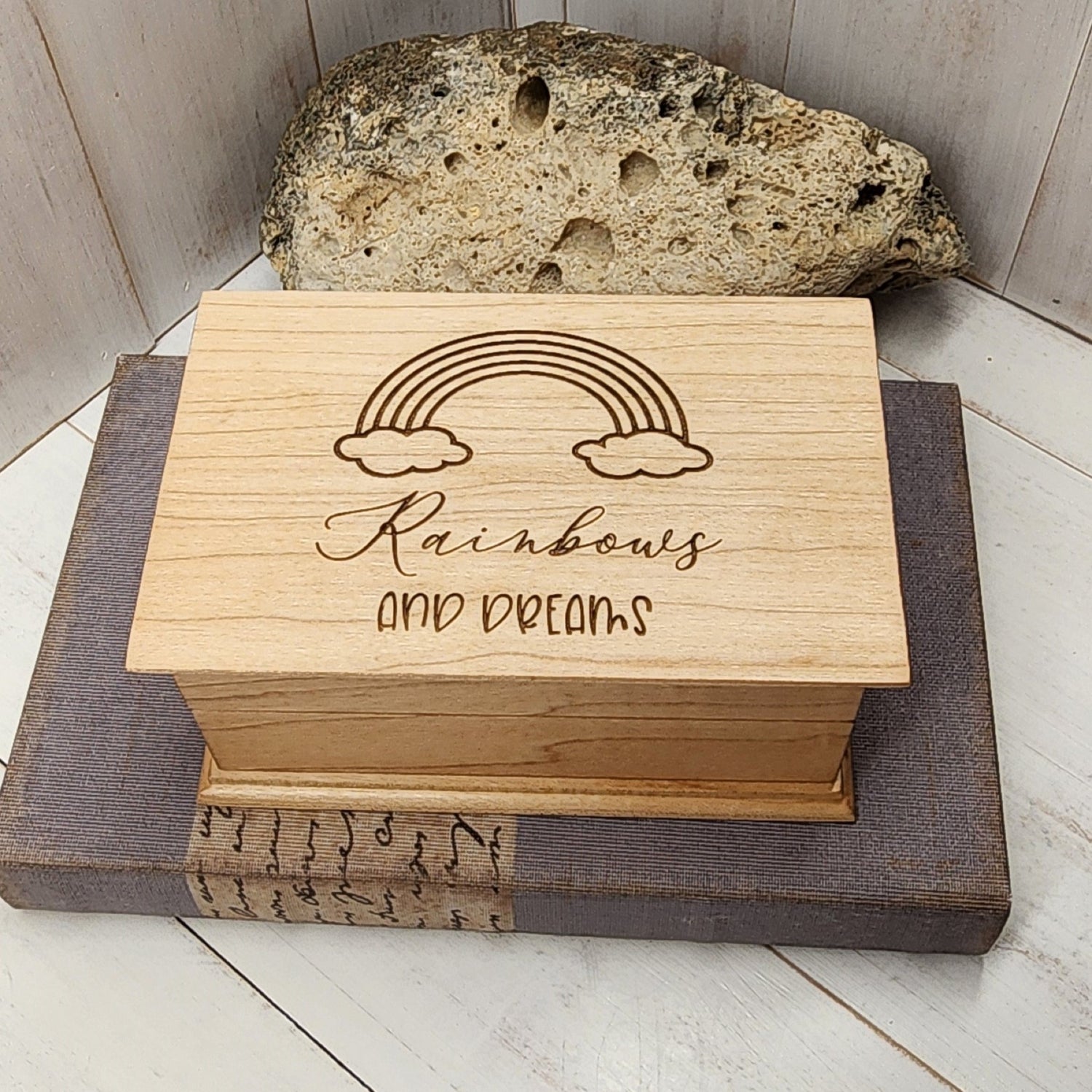 This listing includes 1 wooden musical jewelry box with the carving on pic 1 on it (rainbow design) with your choice of color and song! If you'd like a different engraving, please contact me before placing your order so we can discuss the design and the layout.