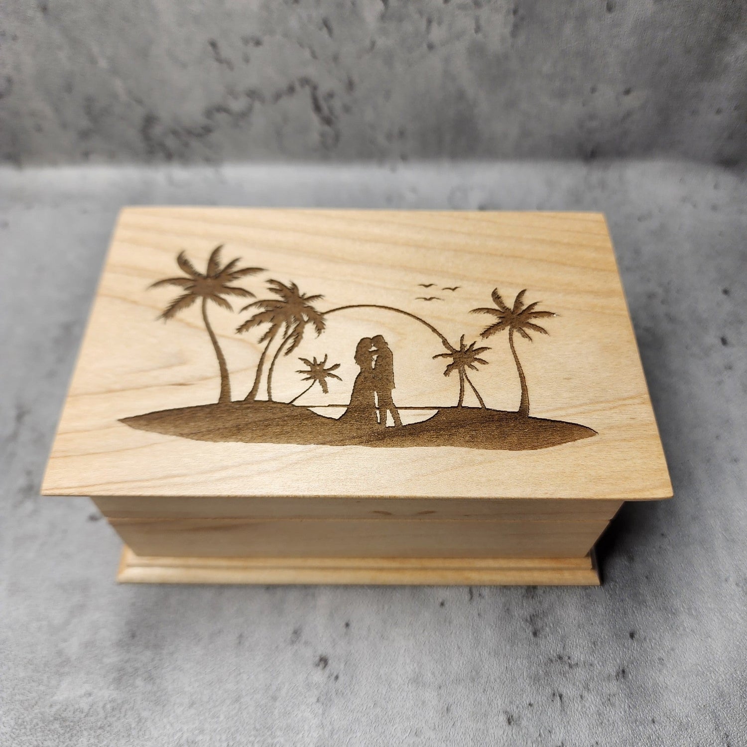 This listing includes 1 wooden musical jewelry box with the carving on pic 1 on it (sunset beach wedding design) with your choice of color and song! If you'd like a different engraving, please contact me before placing your order so we can discuss the design and the layout.